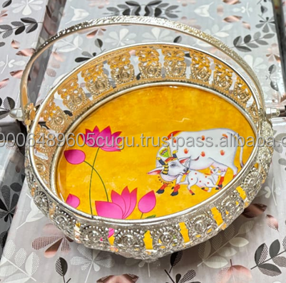 German Silver Pichwai Print Basket for Bridesmaids Favor Festive Return Gift Wedding Gifts Candy, Chocolate & Dry Fruit Hamper
