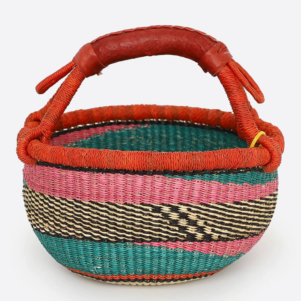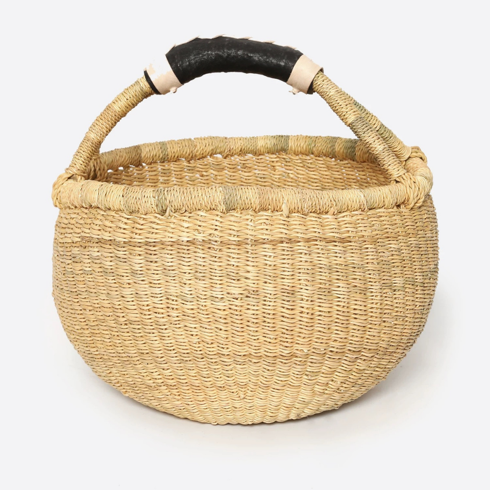 Ghana Handmade Bolga Basket from Natural Grass with Leather Wrapped Handle for Decorative Storage and Grocery Tote