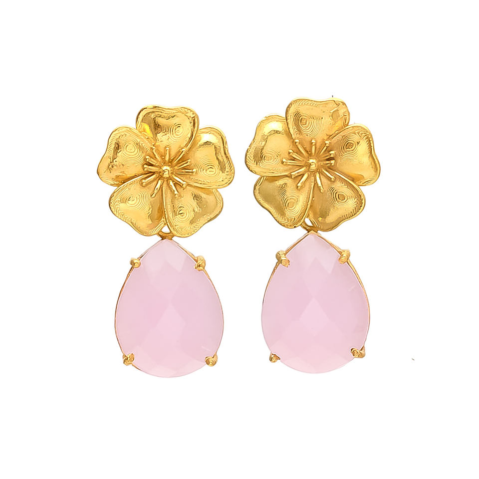 Gilded Gold Plated Flower Earrings Adorned with Radiant Baby pink Gemstone, Perfect for Passion to Any Outfit