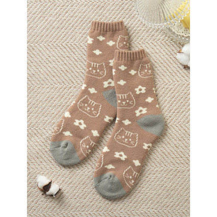 Girl's Brown Character Fleece Sleep Socks One Size Fluffy Soft Custom Embroidery Print Spring Knitted Nylon Silk for Warm Sleep