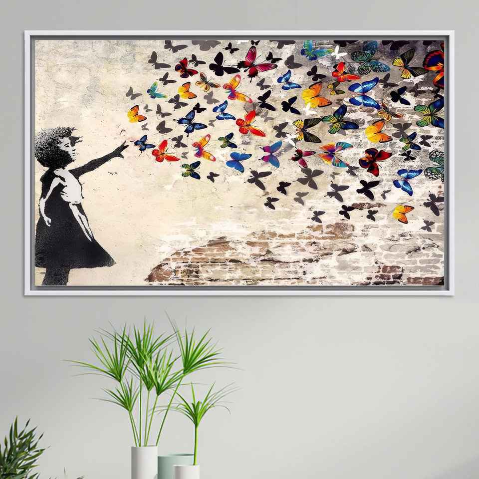 Girl with Butterflies Graffiti Art Print: Colorful Urban Canvas,WHITE FRAMED CANVAS