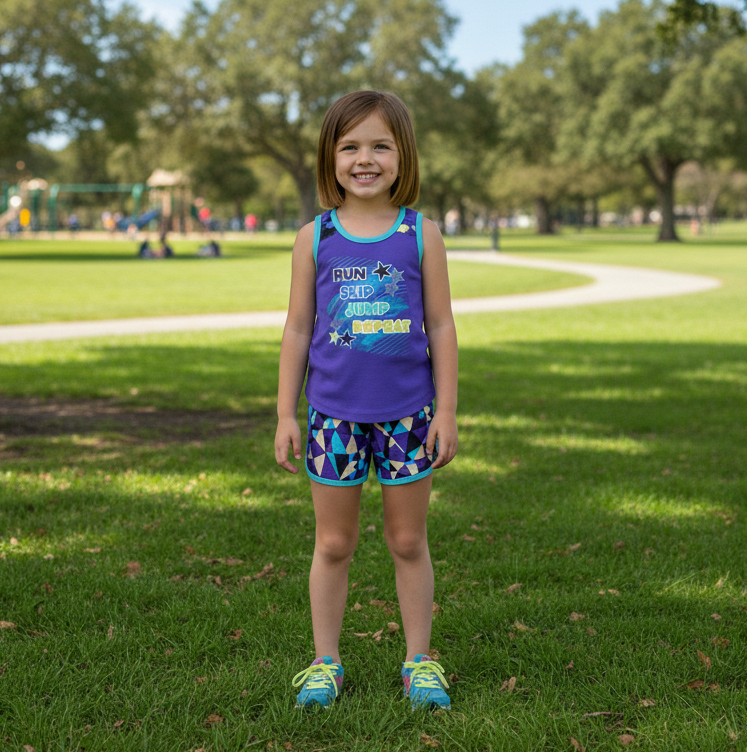 Girls' Casual 2-Piece Spring Outfit Racer Back Tank & Shorts | Fun Run Skip Jump Design for Dance and Play Quick Dry