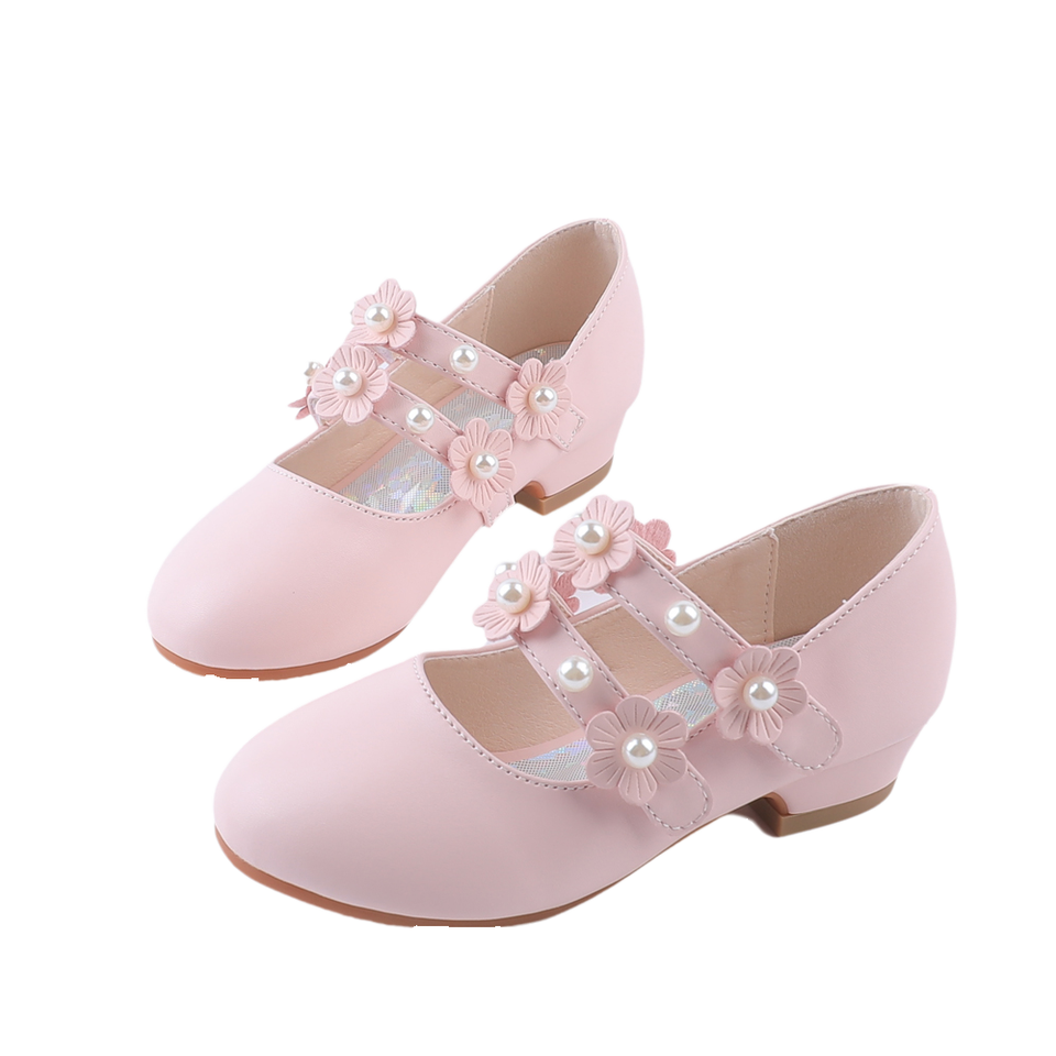 Girls Children Pink Princess Dress Shoes 2025 New Breathable Flower Pearl Decor Double Strap Mary Jane Shoes Hook Loop Closure