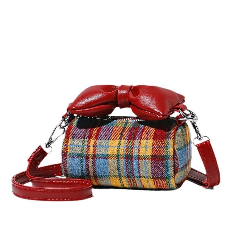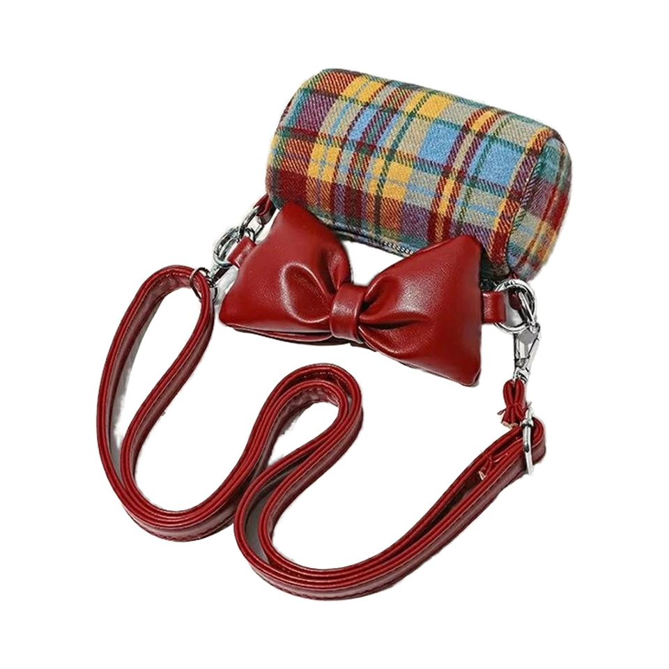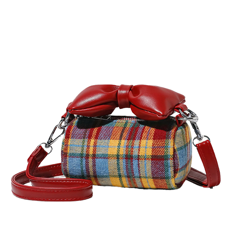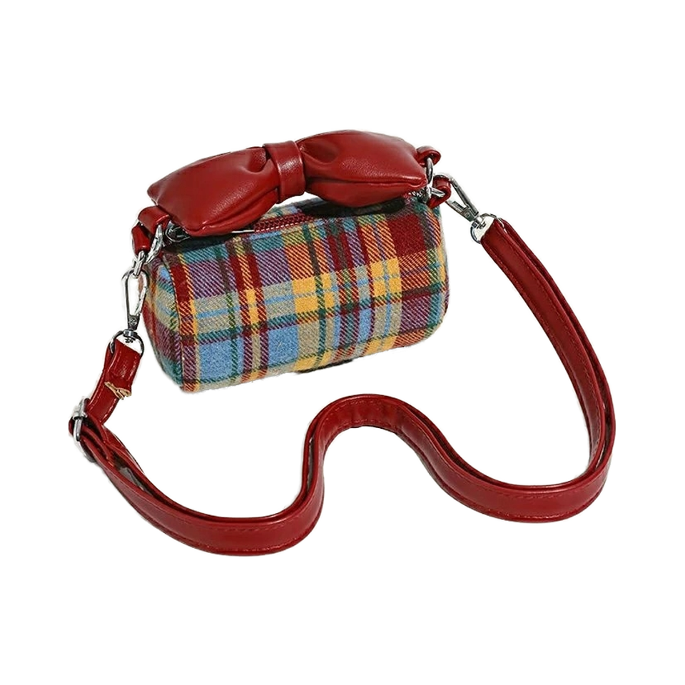 Girls' Plaid Nylon Crossbody Bag with Bow Handle and Zipper Closure