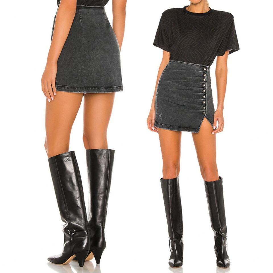 Girls Short Denim Skirts Black Faded Distressed Front Snap Button Closure Pleated Mini Jean Skirt Women