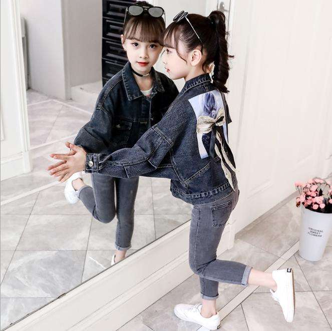 Girls Short Loose Blue Casual Denim Jackets With Bow Tie on the Back From Wholesale Children Factory