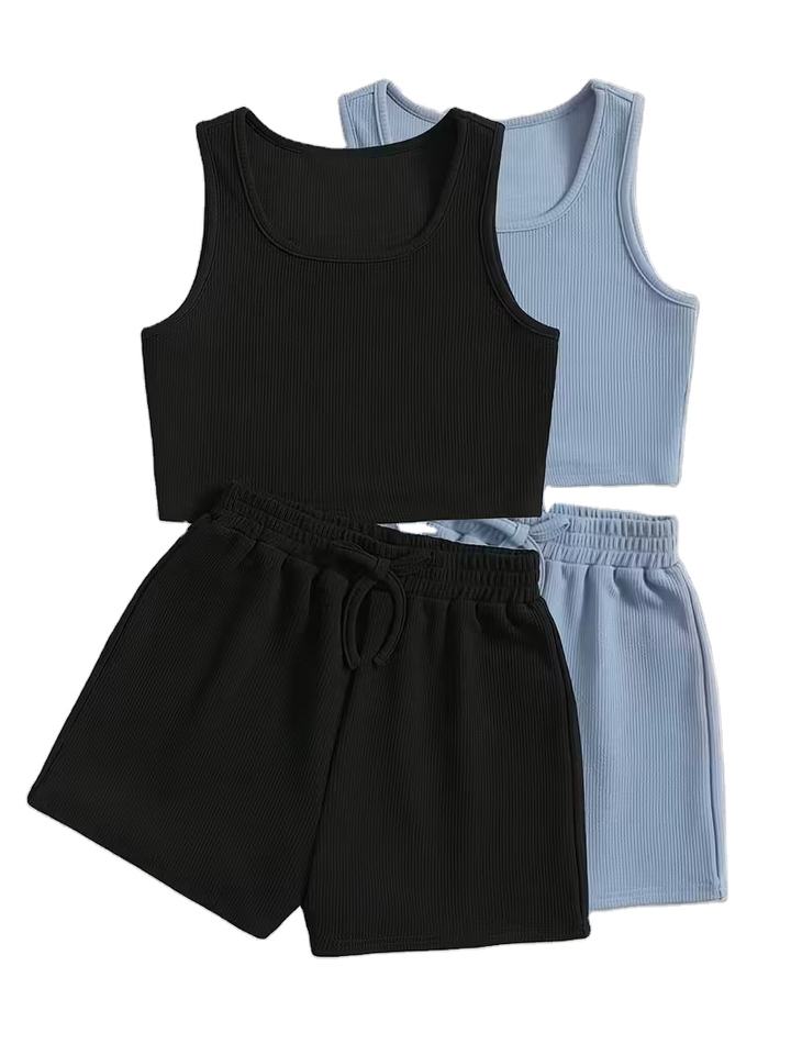 Girls' Solid Color 100% Cotton Anti-Wrinkle Tank Top and Bow Belt Shorts Spring/Summer Sports Set for Outdoor BSCI Certified