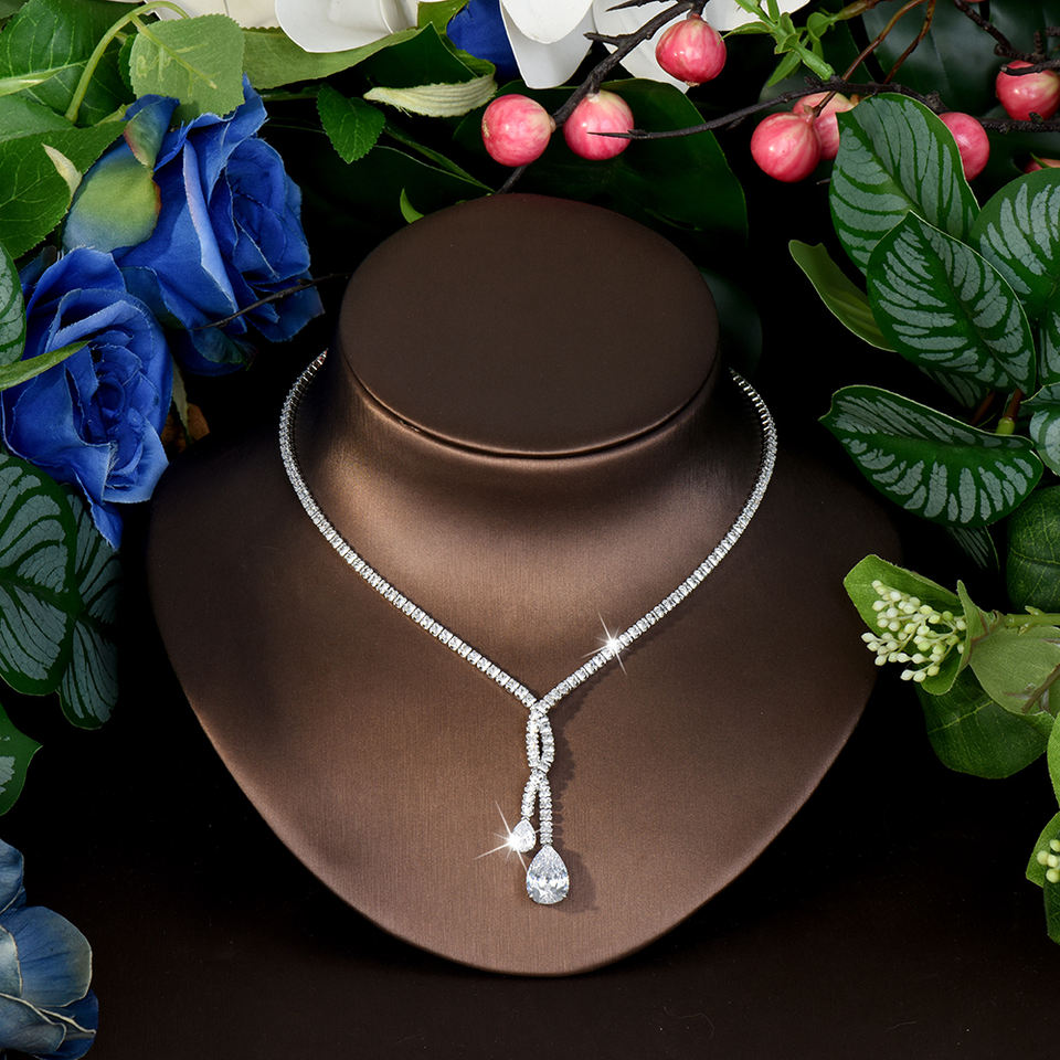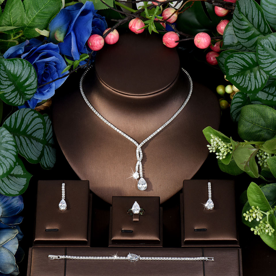 Glamorous Cubic Zirconia Dangle Water Drop Wedding Party Dubai Nigeria Bridal Necklace Earrings Jewelry Sets for Women S-444