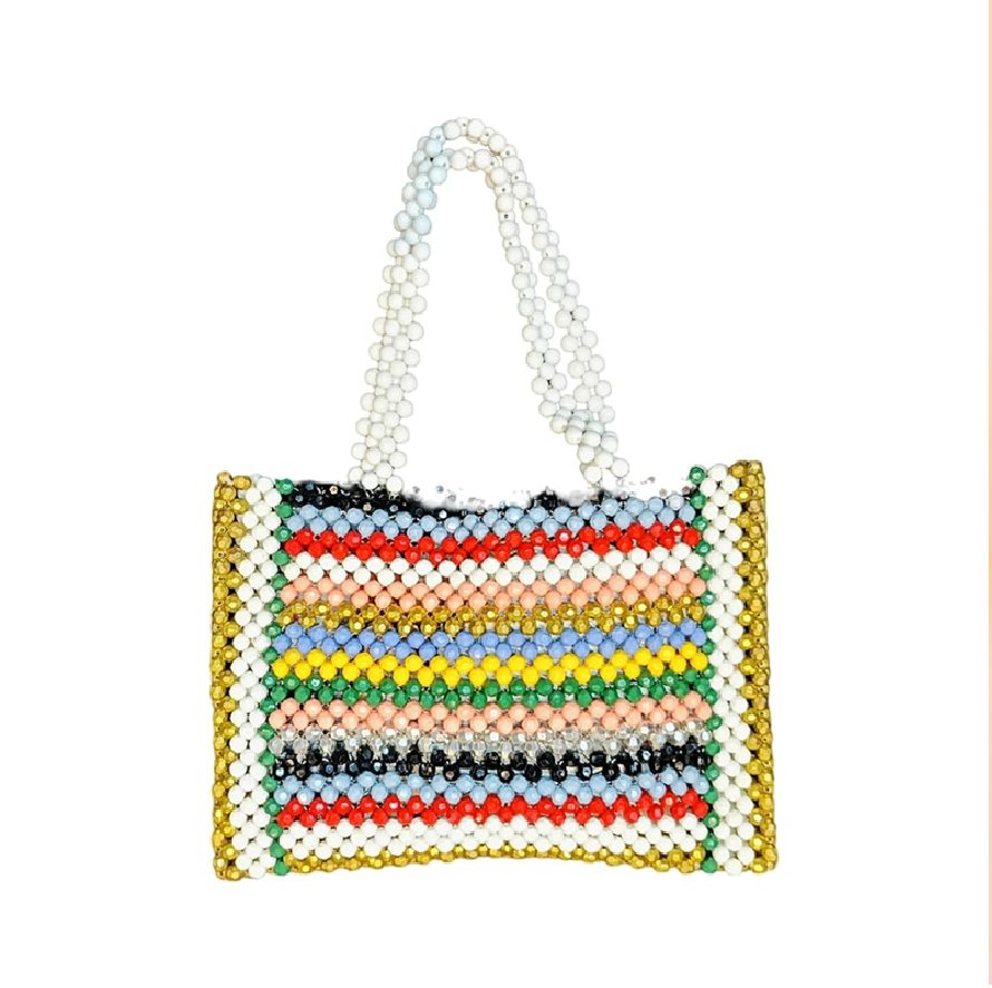 Glamorous golden sphere beaded pouch, structured bucket shape, unique top handle, handcrafted evening bag, at wholesale prices.