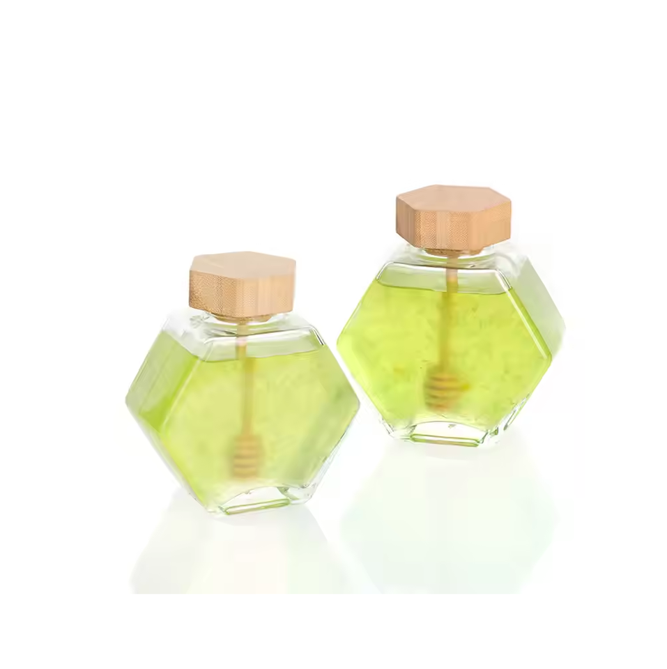 Glass Honey Box With Wooden and Cork Lid Hexagon Shape Honey Container Dispenser Storage Hot Selling
