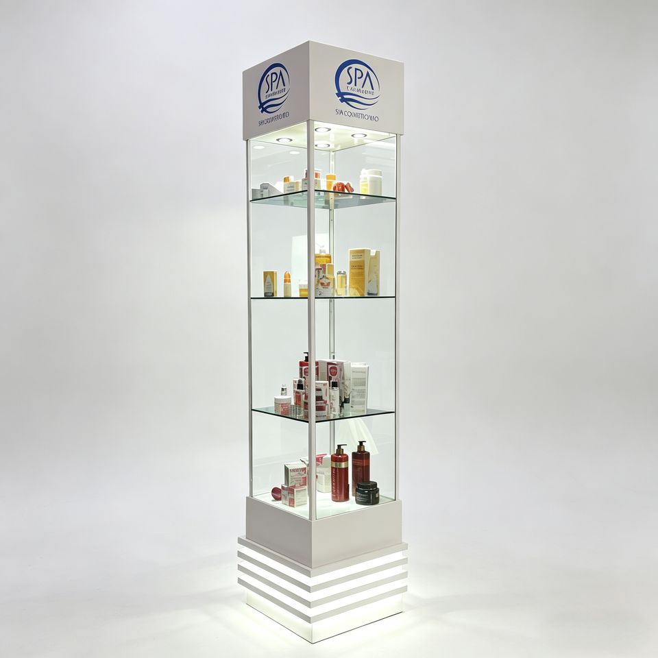 Glass Showcase Cabinets with LED Lighting Lockable Floor Display for Secure Elegant Presentation of Perfume & Beauty Products