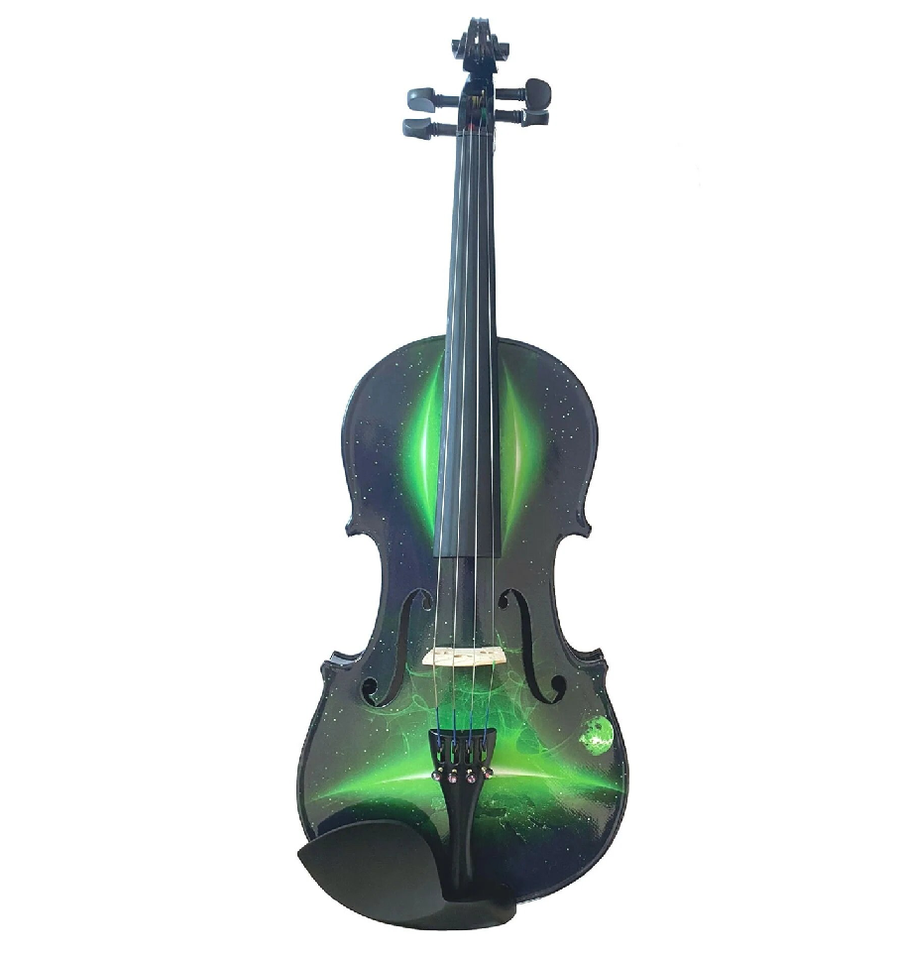Glossy emerald green violin with black trim, stunning two-tone fade finish, cool and vibrant instrument, at wholesale prices.