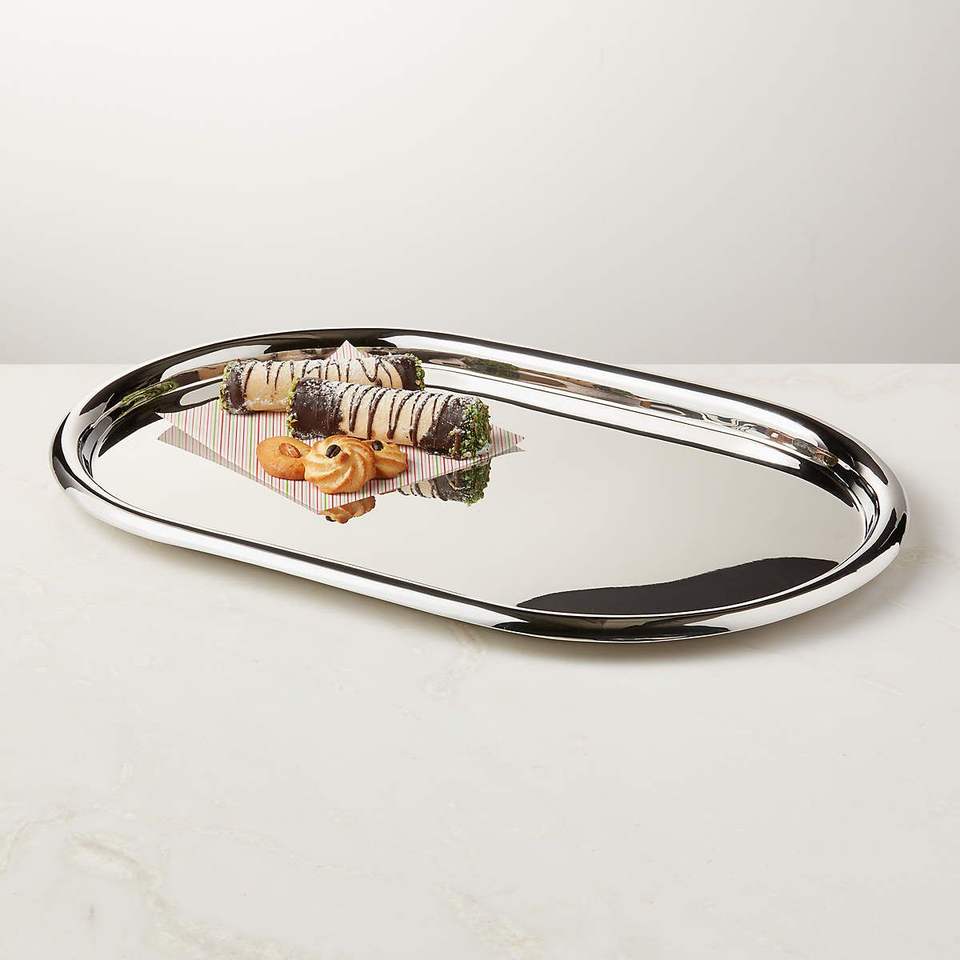 Glossy stainless steel serving tray with fine polish for high end food presentation in hotels and homes alike