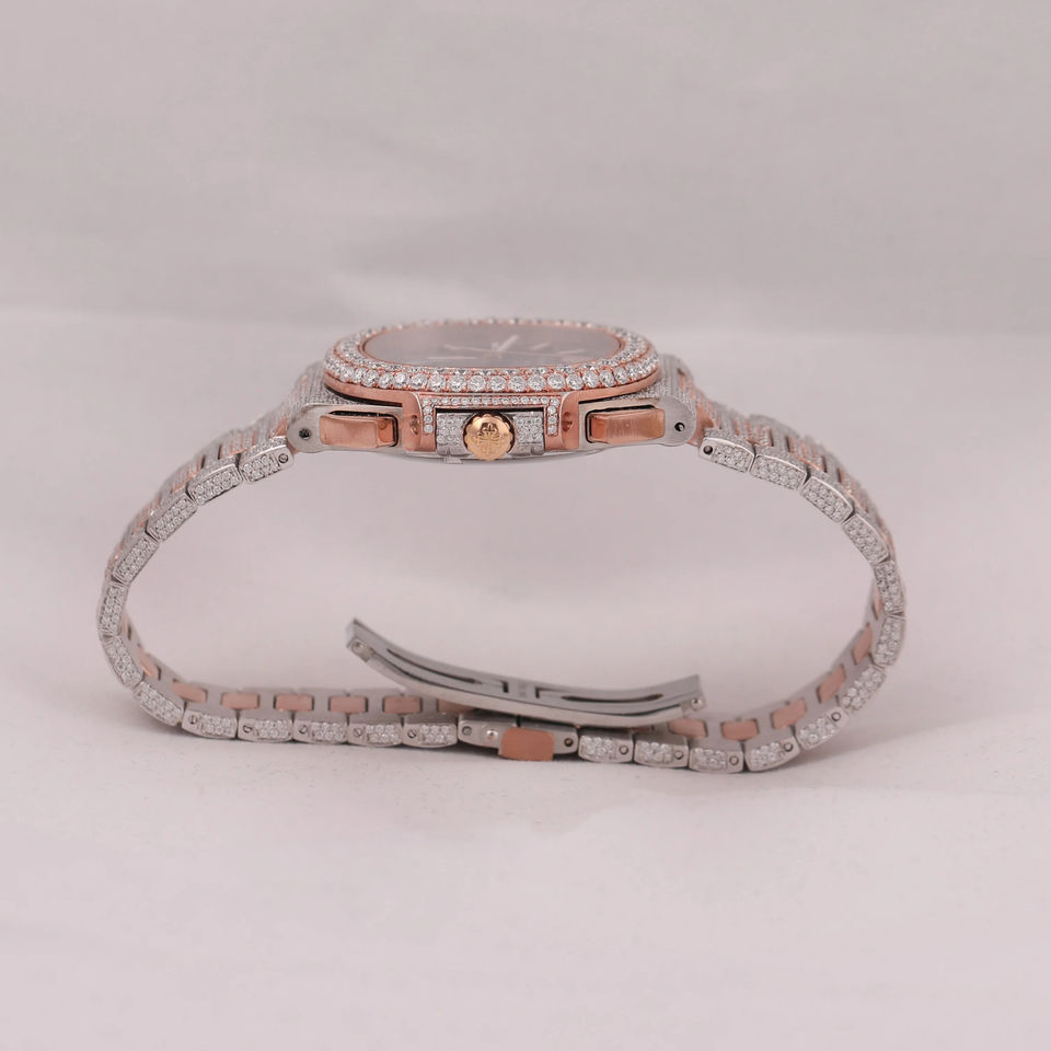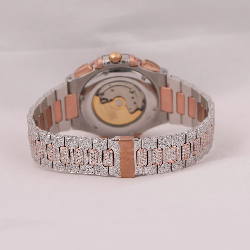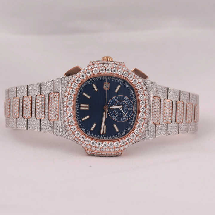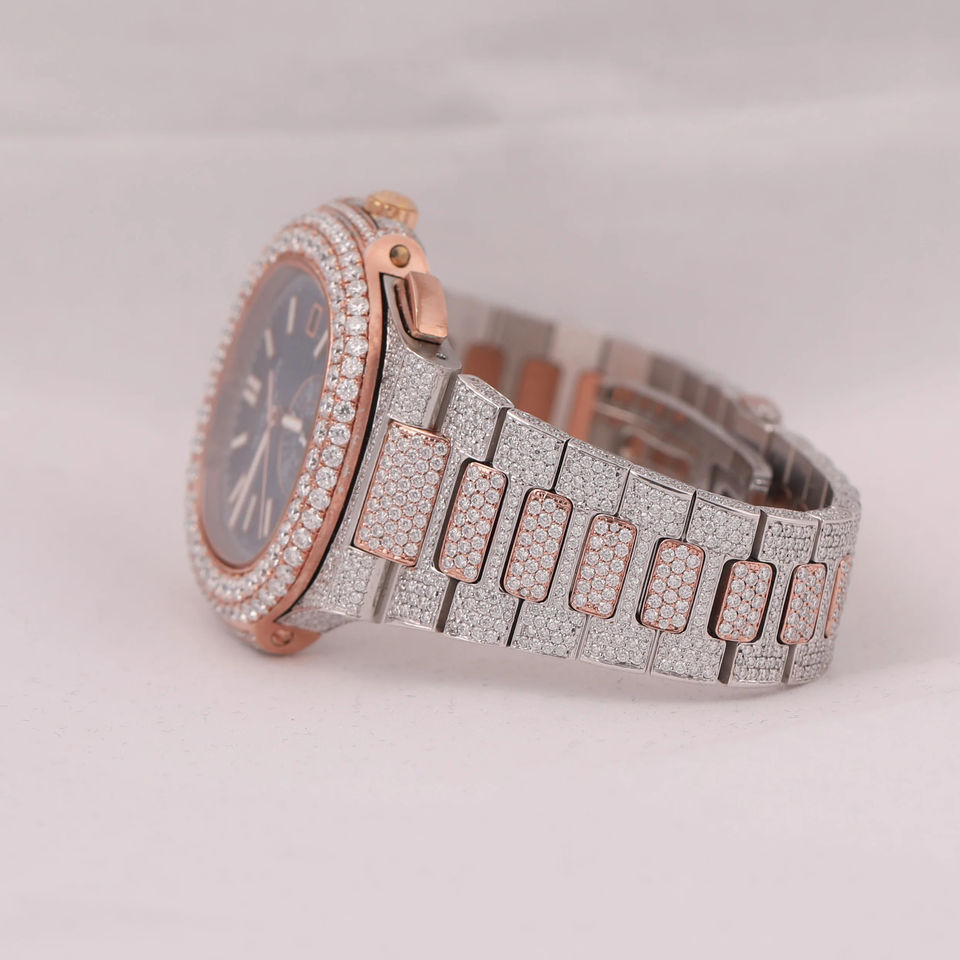 Gold Edition 47mm Two-Tone VVS Moissanite Diamond Crown Watch Fully Iced Hip Hop Style Royal Blue Auto-Date Dial Unisex Fashion