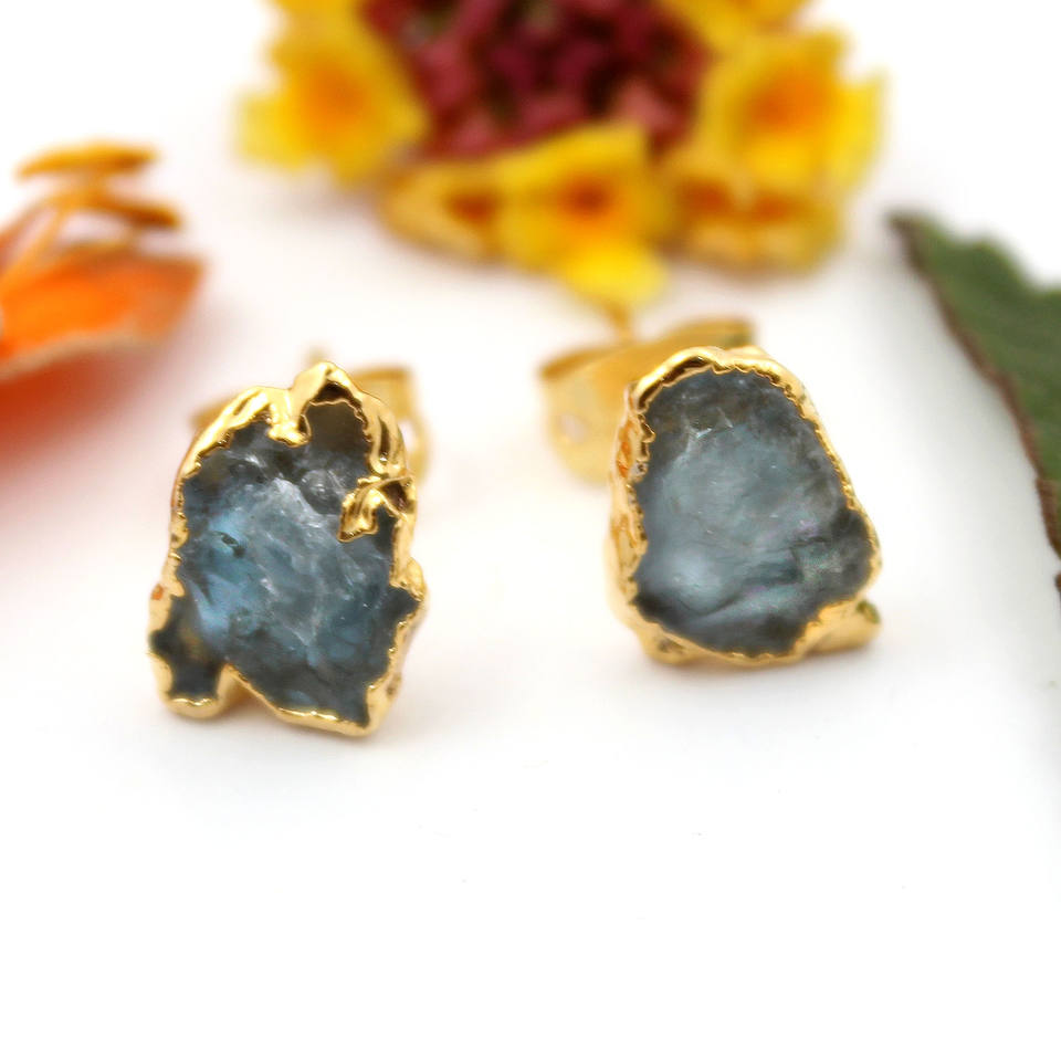Gold Electroplated Rough Aquamarine Stud Earrings Birthstone Jewelry For March