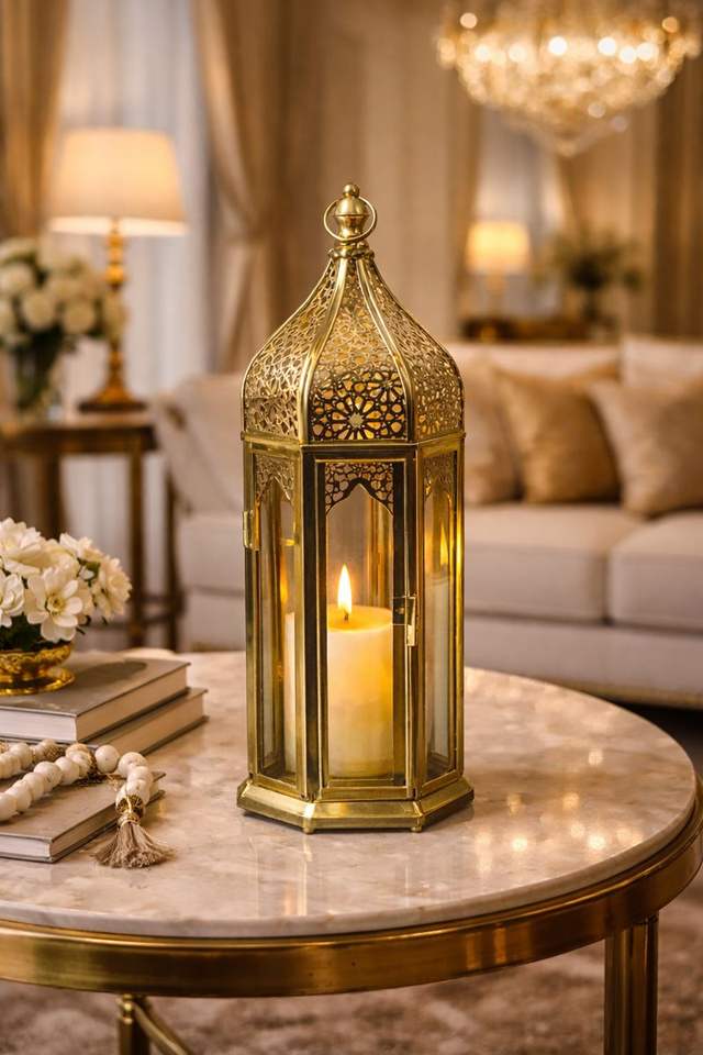 Gold Finish Metal Moroccan Lantern with Glass Panels Intricate Cutwork Warm Candle Glow for Festive Home Decor and Gifting