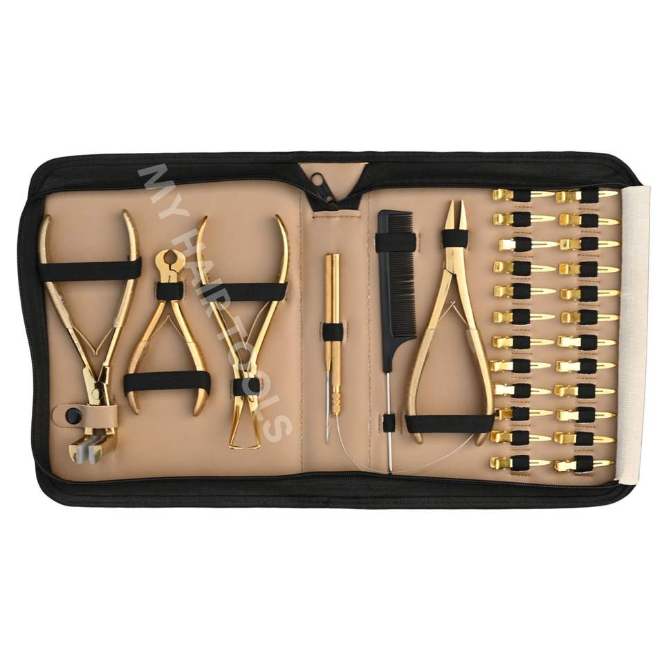 Gold Hair Extension tools Kit with Bead Remover Plier Flat Crimping Plier Comb Tape Extension Applicator 24pcs Sectioning Clips