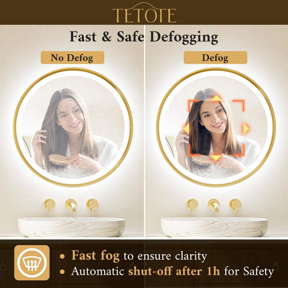 Gold LED Bathroom Vanity Mirror Metal Framed Circle Front Backlit 3 Color Stepless Dimmable Anti Fog Shatterproof Wall Mounted