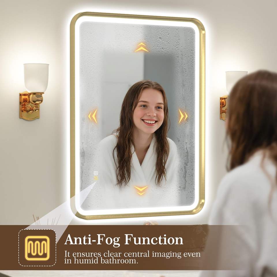 Gold LED Touch Switch Salon Bathroom Vanity Mirror Front Backlight Metal Frame Anti-Fog Stepless Dimmable 3-Color Temperature