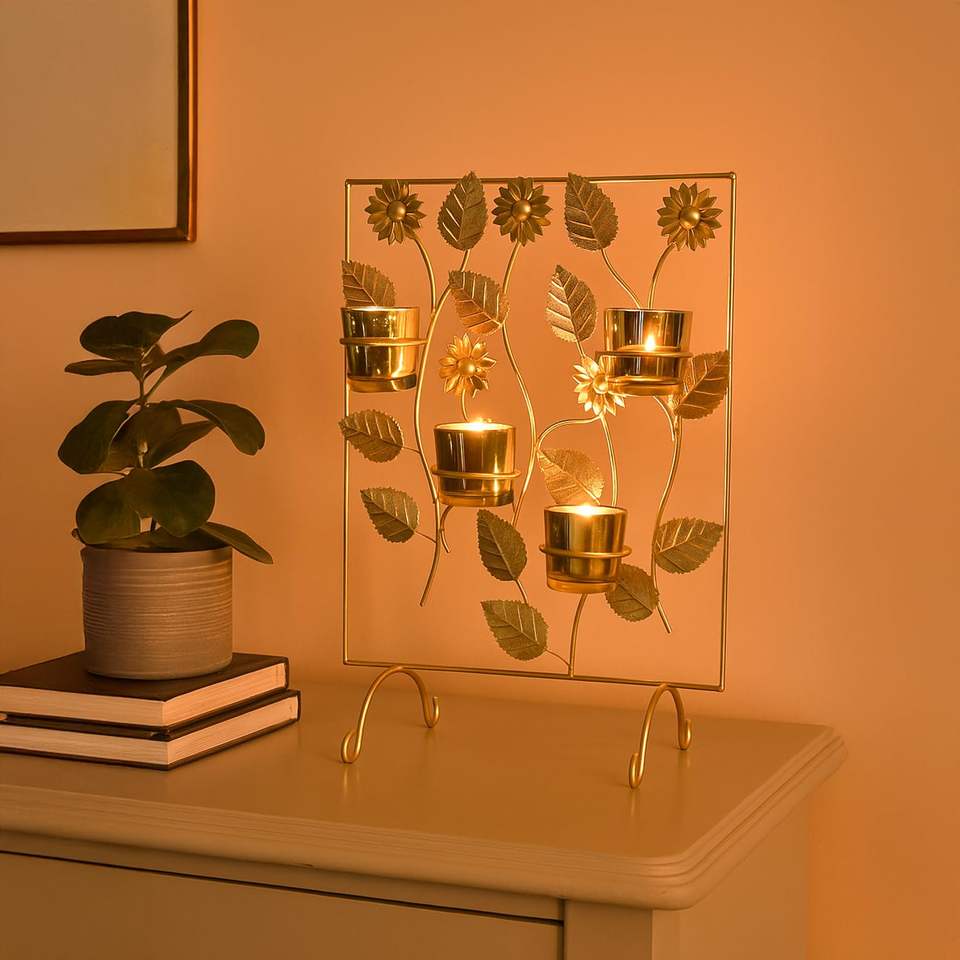 Gold Metal Flower Tealight Candle Holder Frame with Five Cups Decorative Stand for Home Living Room Festival Wedding Decor