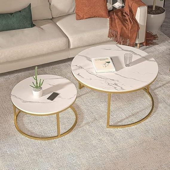 Gold Metal Frame MDF Faux Marble Top Modern European Coffee Table Set 2 Piece Nesting Stacking Handcrafted Living Room Furniture