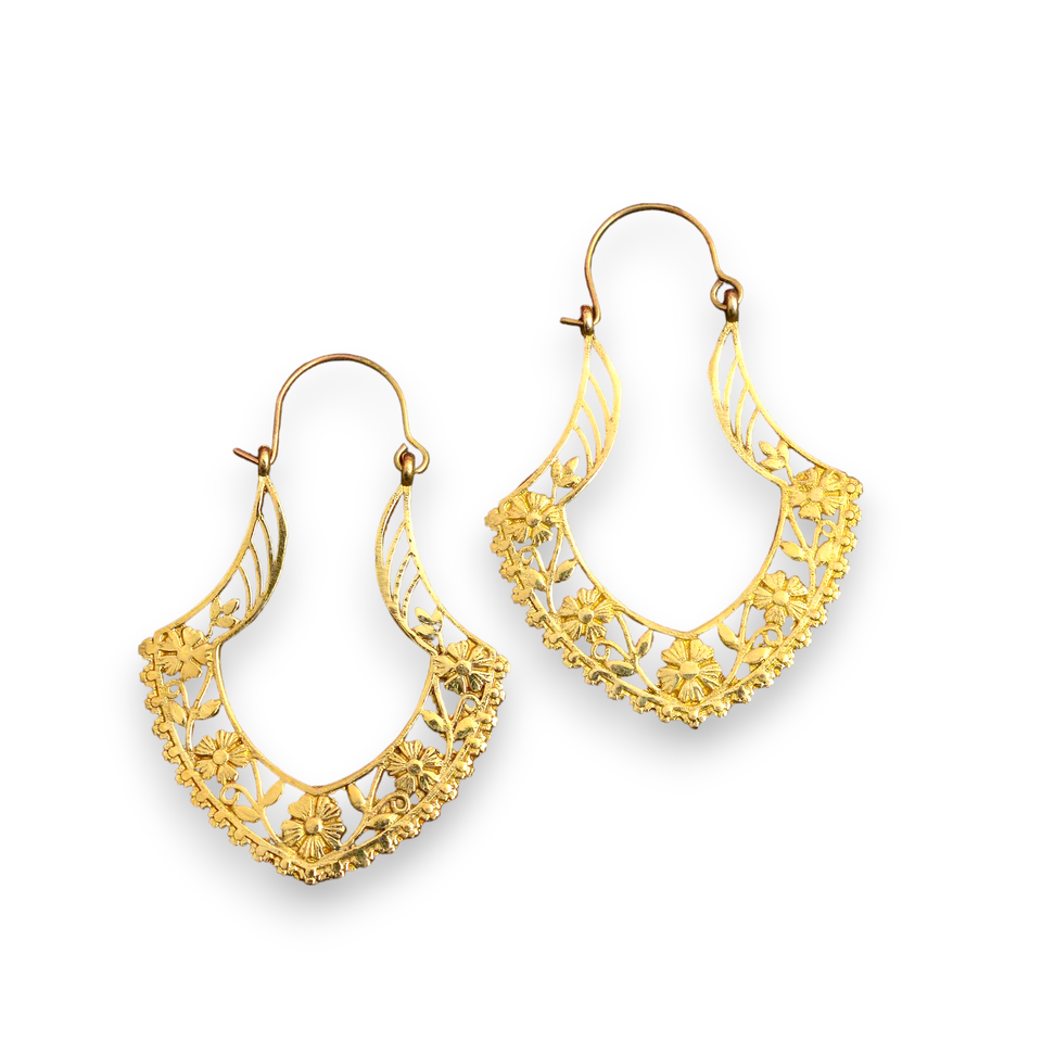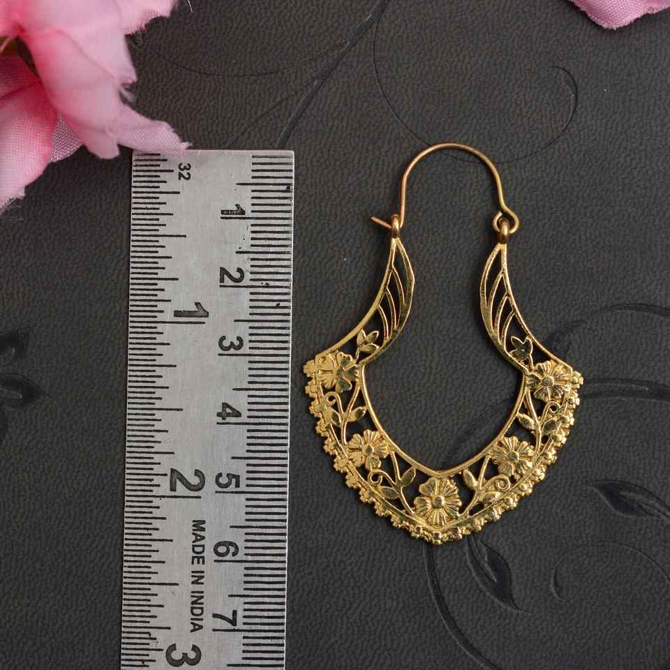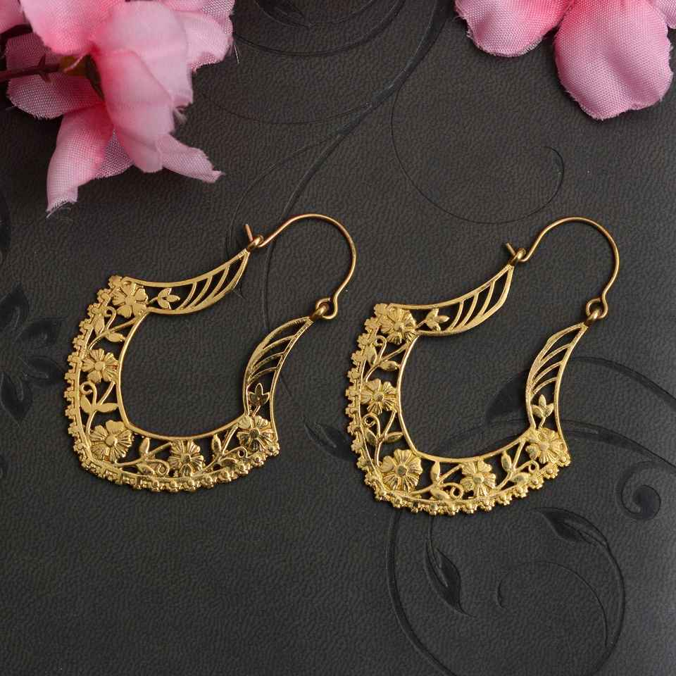Gold Plated Brass Floral Filigree Hoop Earrings Lightweight Dangle Ethnic Handmade Earrings Designer Jewelry For Women