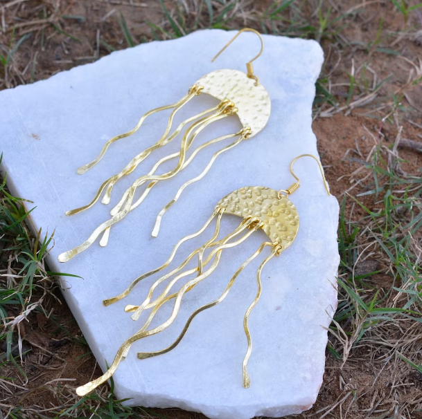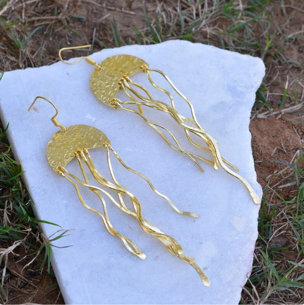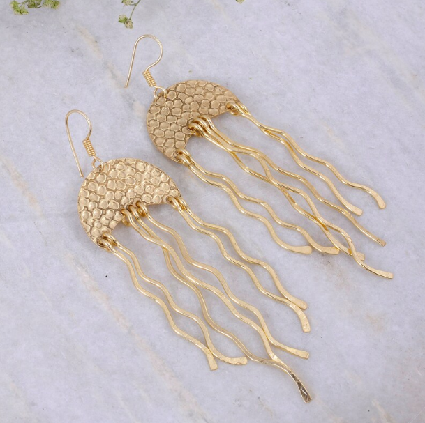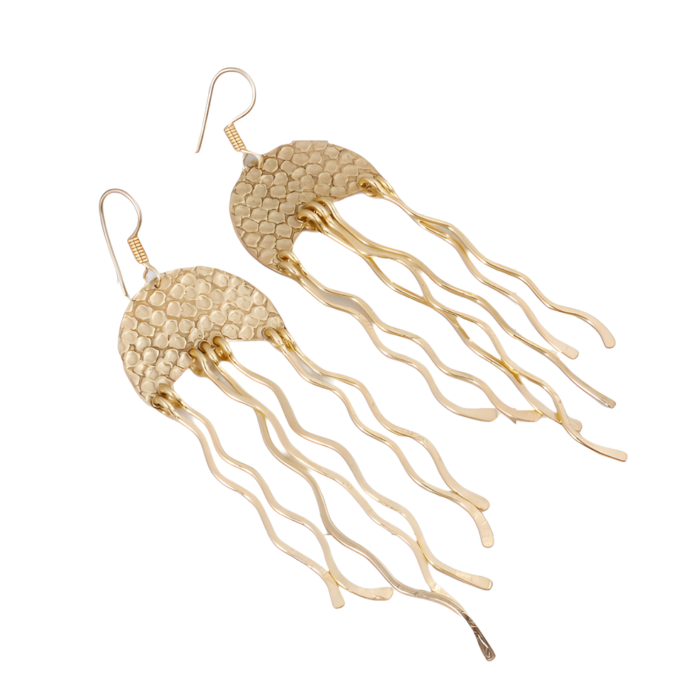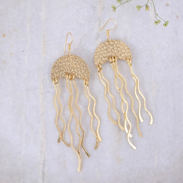 Gold Plated Brass Jellyfish Earrings | Long Wavy Tentacle Dangle Earrings | Handmade Ocean-Inspired Statement Jewelry