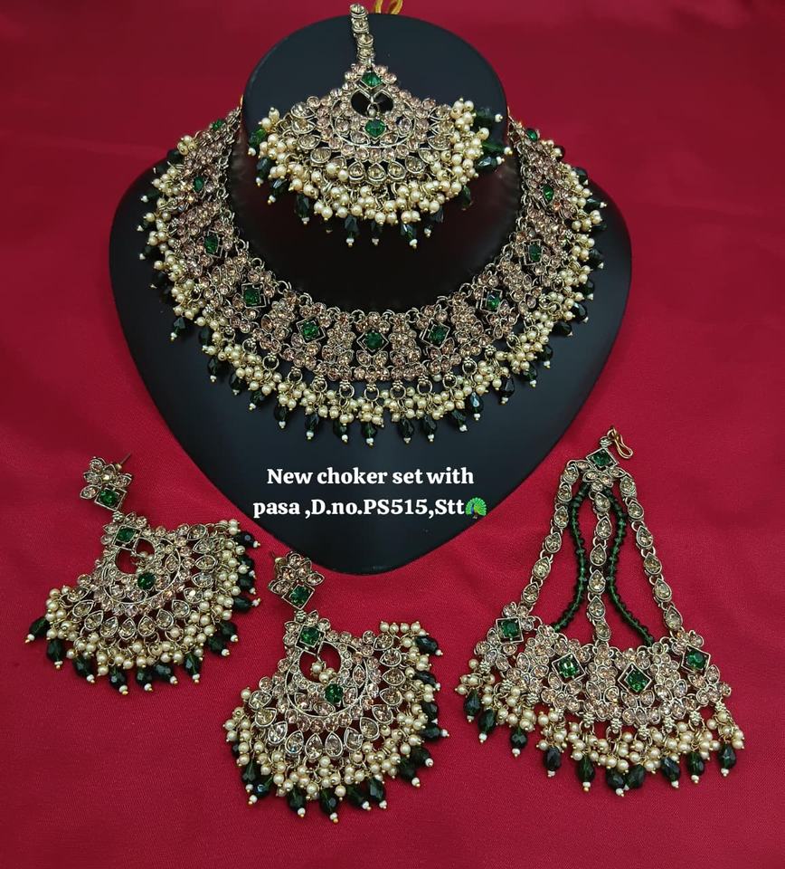 Gold Plated Ethnic Bridal Shadow Choker Necklace Set Earrings Maang Tikka Trendy Handmade Jewelry for Wedding Engagement