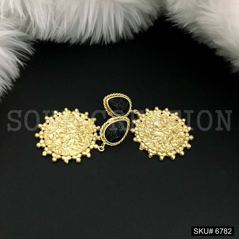 Gold Plated Carved Black Onyx Stone Twisted Wire Hammered Round Shape Drop and Dangle Earrings SKU6782