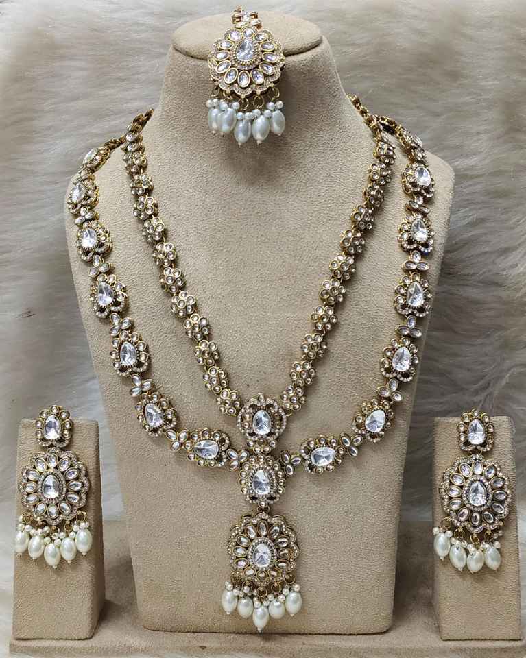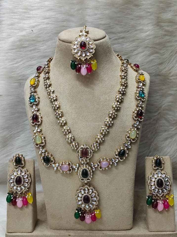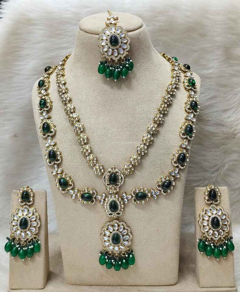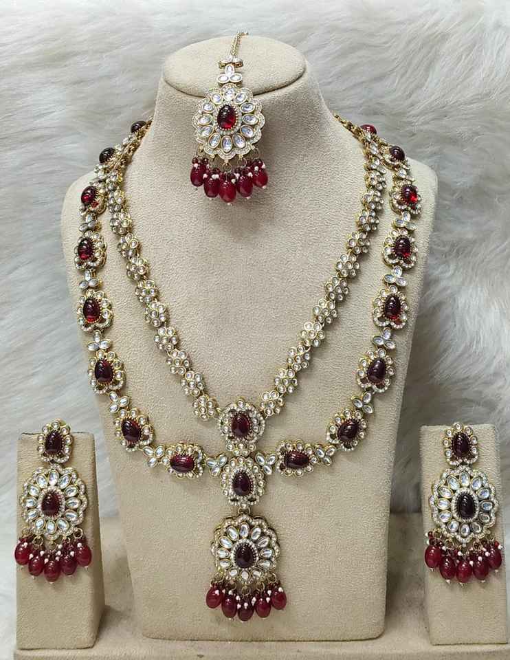 Gold Plated Double Layer Handcrafted Kundan Green Detailing Ruby & White Beaded Choker Jewellery Set Handmade Bulk Product