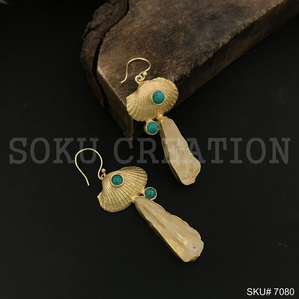 Gold Plated Ear Wire Shell Design Turquoise Gemstone Designer Earrings Brass Metal Fashion Earring From Seller And Manufacturer