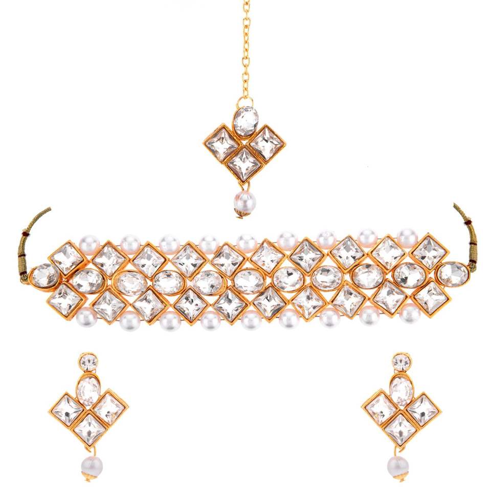 Gold Plated Fashion White Crystal Faux Pearl Boho Vintage Antique Statement Choker Necklace Earrings Maangtikka Jewelry set