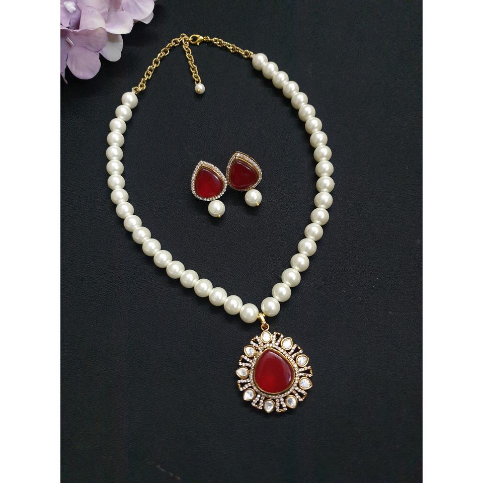Pearl Kundan Necklace Set with Red Stone Pendant and Earrings Traditional Jewelry for Women Elegant Bridal and Party Wear Set