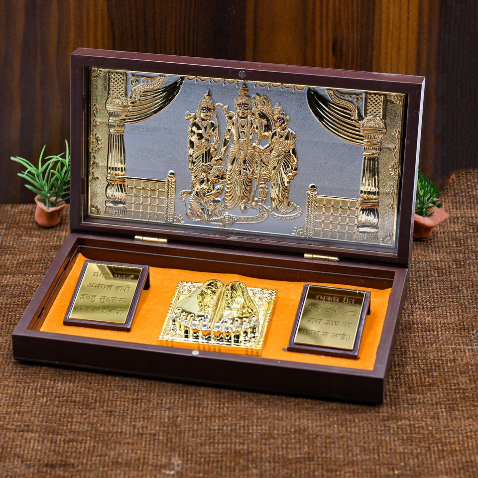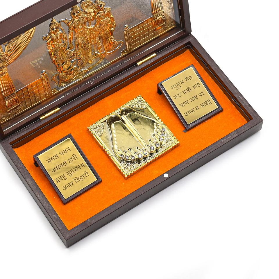 Gold Plated God Idol Charan Paduka Ram Darbar Photo Frame with Charan Paduka for Wedding Return Gift Wooden Gift Prosperity Gift