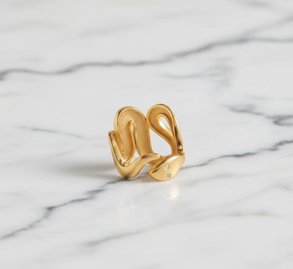 Gold Plated Handmade Snake Adjustable Ring with White CZ for Women