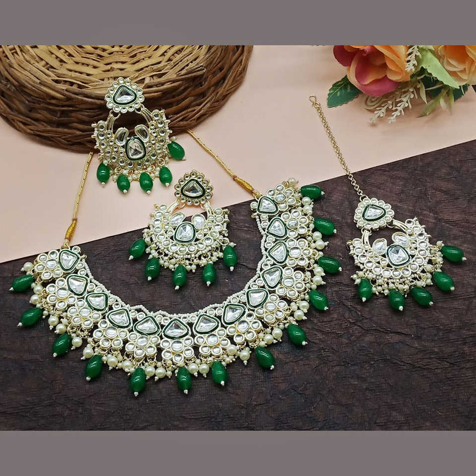 Gold Plated Kundan Fine Jewelry Set with Pearl and Beads 10581195GR Necklace Set