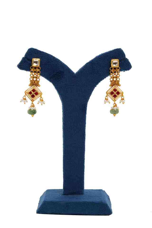 Gold Plated Kundan Necklace Set with Pearl Chain Square Motif Red Green Stones Traditional Indian Bridal Jewelry