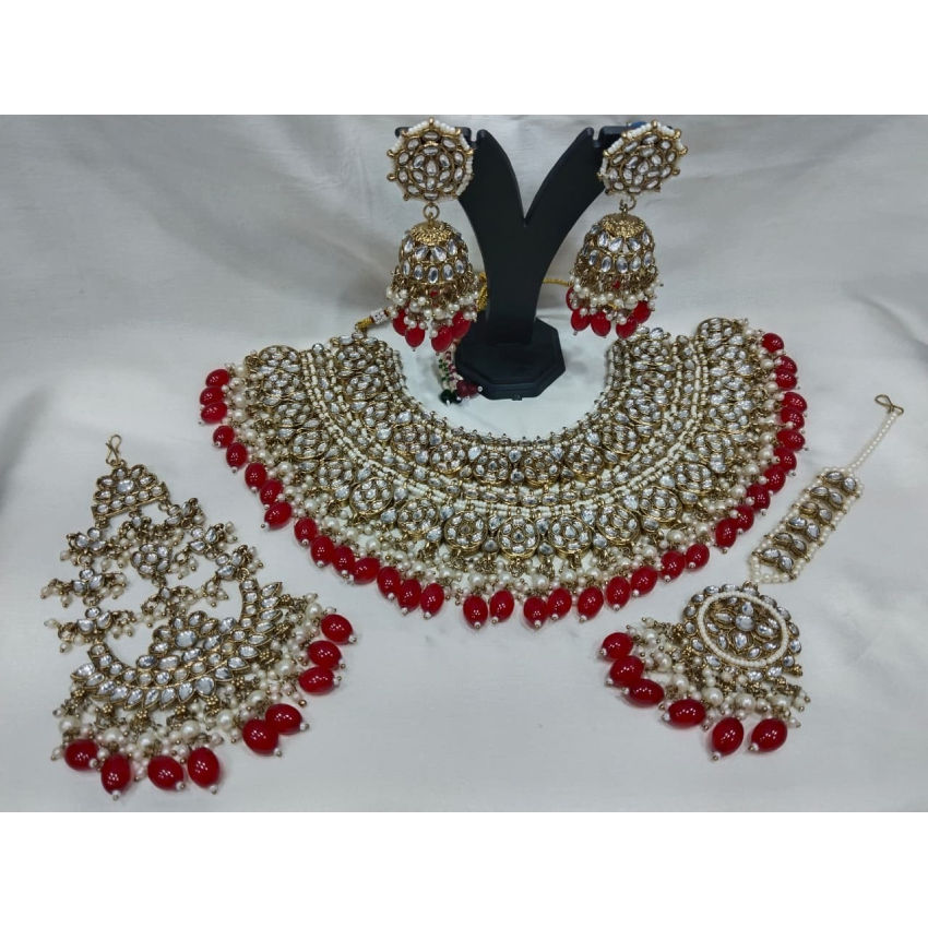 Gold Plated Kundan Pearl Bridal Necklace Set with Maroon Beads Earrings Maang Tikka Indian Wedding Jewelry for Party Engagement