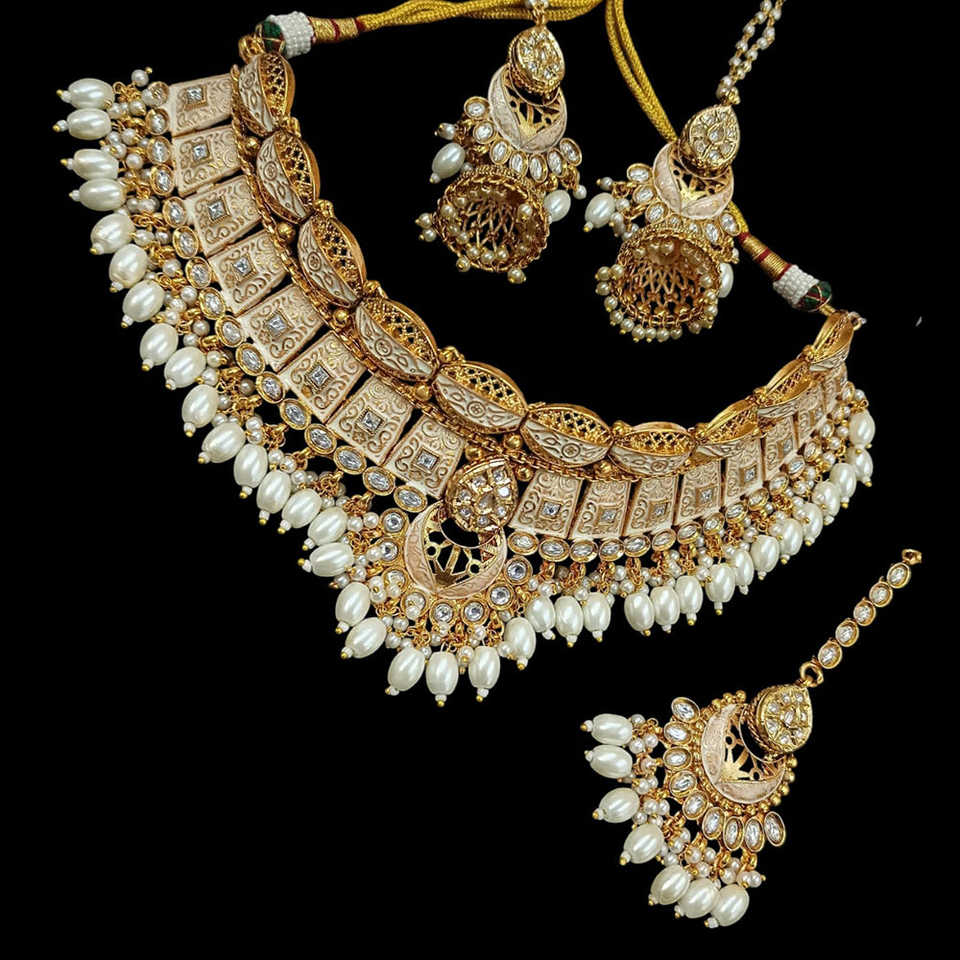 Gold Plated Meenakari Choker Necklace Set with Pota Stone and Pearls 13111164WH Fine Jewelry Set