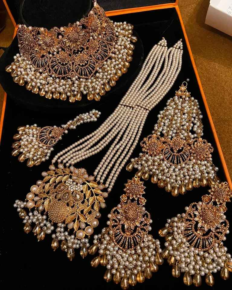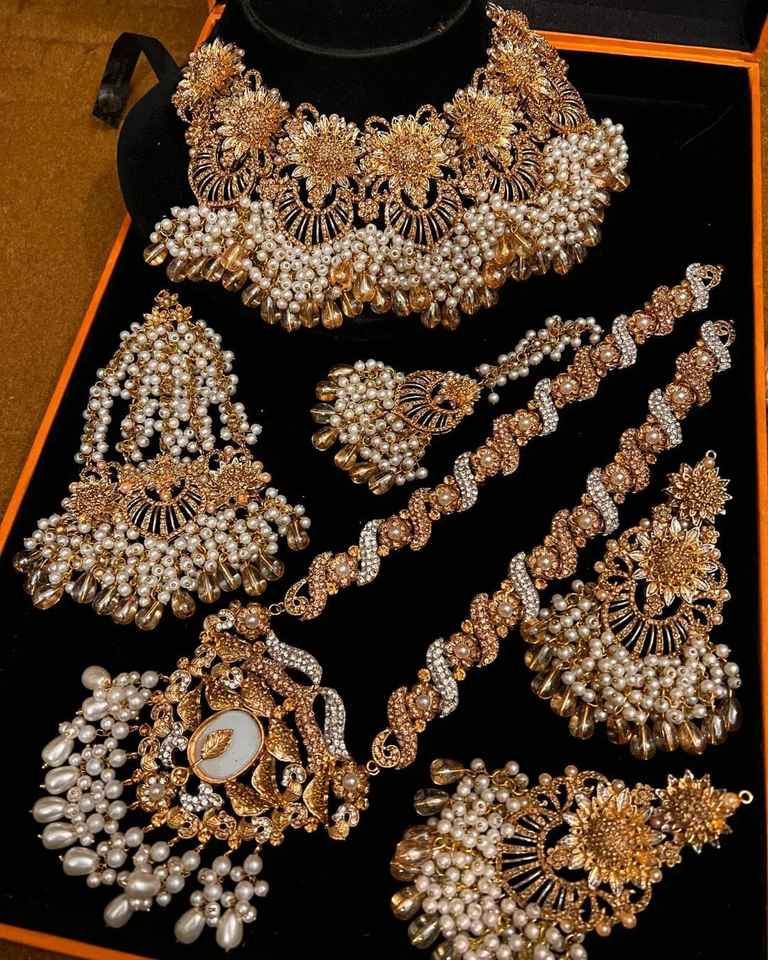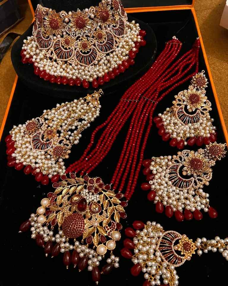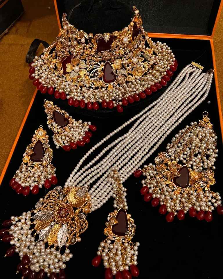 Gold Plated Necklace Set in Cz and Ruby Stones with Pearls Beads Custom Demand Color
