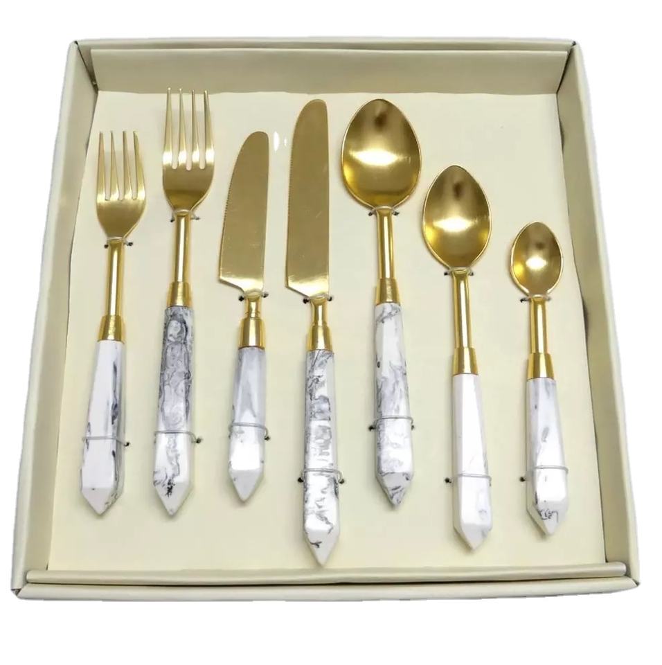 Gold Plated New Cutlery Set of 7 With Marble Handle New Metal Flatware Set New Latest Cutlery Set in Wholesale Price