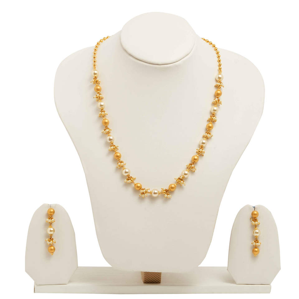 Gold Plated Pearl And Gold Beads Necklace Set With Matching Earrings Elegant Traditional Jewelry For Women
