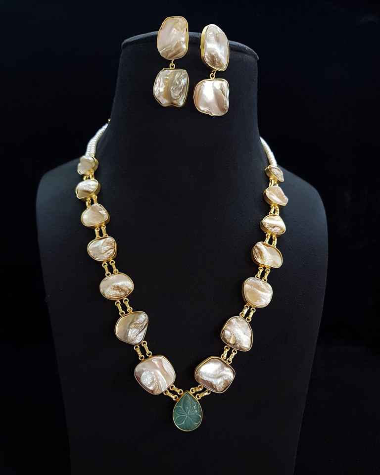 Gold-Plated Pearl Beaded Brass Long Jewellery Set color wedding wear necklace with earrings