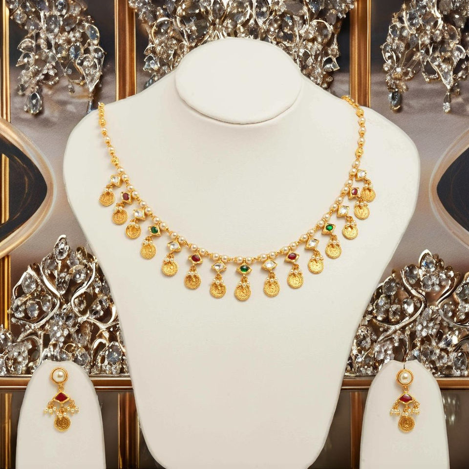 Gold Plated Pearl Beaded Traditional Necklace Set with Multicolor Stones and Coin Charms, Antique Finish Chain with Matching