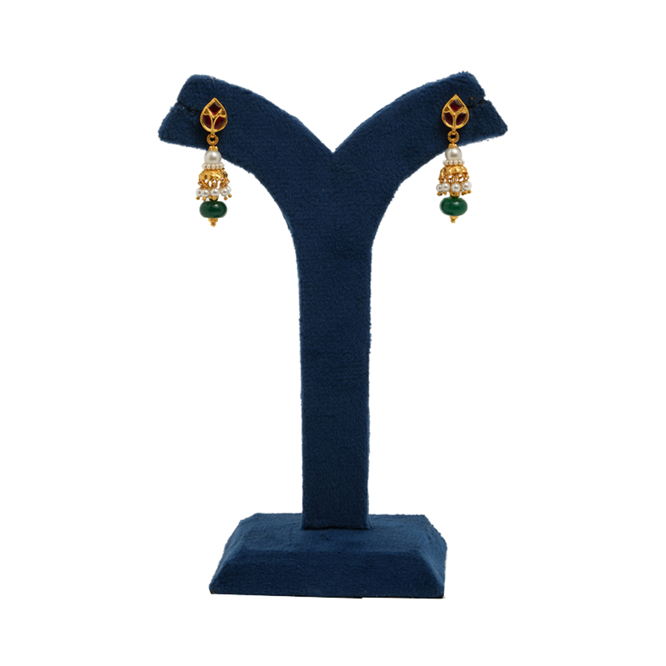 Gold Plated Pearl Jhumka Earrings with Green Bead Drops and Red Stone Studs for Women Traditional Wedding Festive Ethnic Jewelry