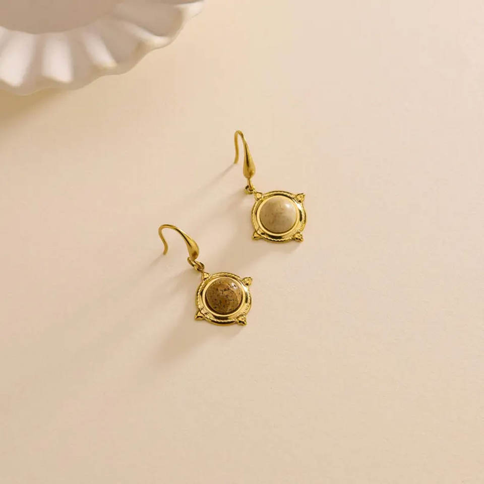 Gold Plated Starburst Compass Dangle Earrings Tan Stone Center Charm-Luxury Celestial North Star Jewelry for Party Occasions