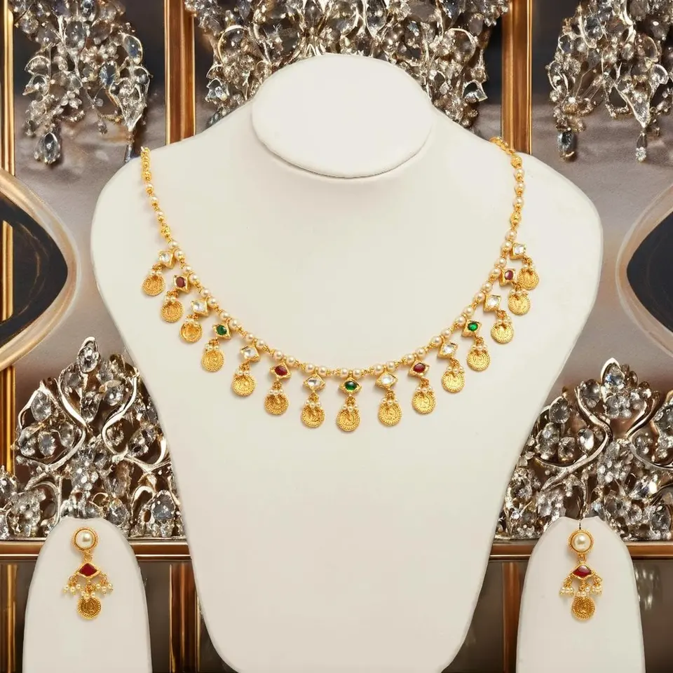Gold Plated Temple Necklace Set with Pearls Ruby Emerald Stones and Coin Charms with Matching Earrings