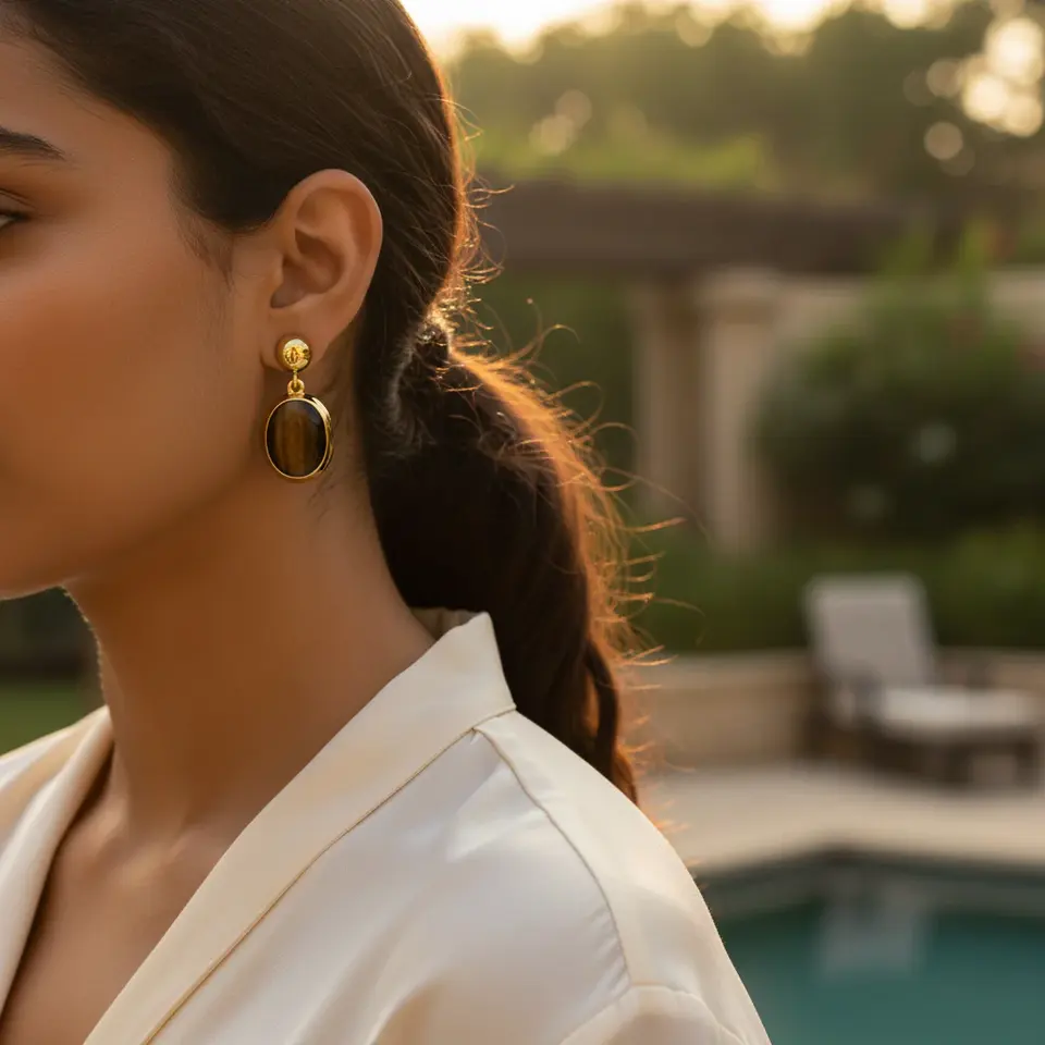Gold Plating Tiger Eye Earrings Elegant Oval Gemstone Dangle Drop Pendant for Women for Weddings Featuring Pearl and Diamond