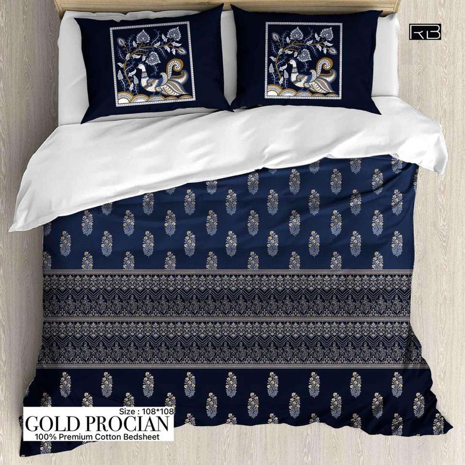 Gold ProCian King Size Premium Cotton Floral Mughal Block Print Dark Blue Luxury Fitted & Flat Bed Sheets