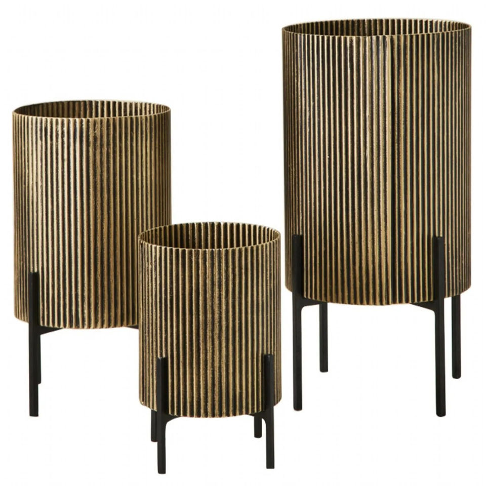 Gold Ribbed Metal Planter Set with Tall Stands Modern Indoor Decoration Plant Pots for Living Room Office Entryway Planter Set